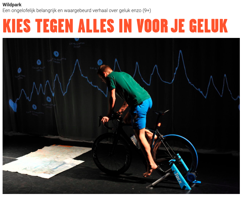Nienhuis en Mijnster zetten een aantrekkelijke TED-talk-achtige performance op de vloer, met een achterdoek dat de mogelijkheid geeft van projecties van heldhaftige en inspirerende foto’s en een grafische verbeelding van de fietstocht. De fiets staat er ook, op een standaard. Al trappend doet Mijnster een deel van het verhaal. Hij heeft zijn keuze gemaakt: een leven buiten in een sportbroek, niet binnen in een pak met stropdas.